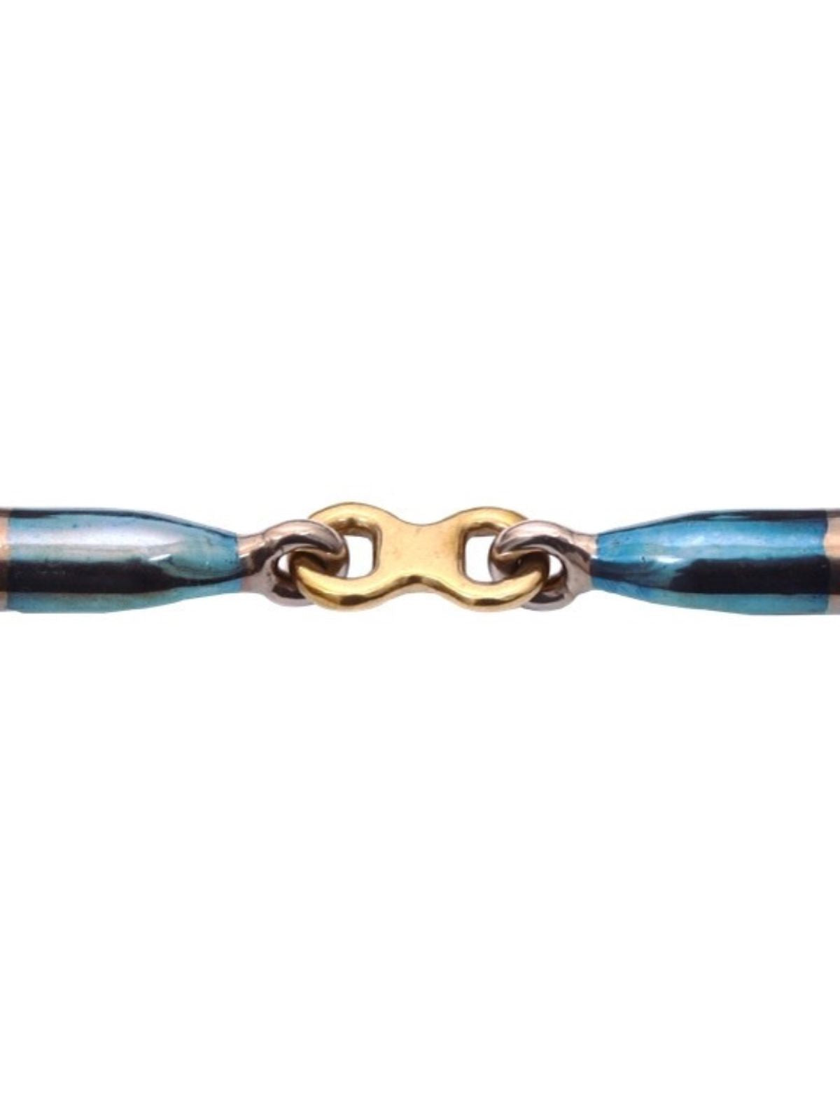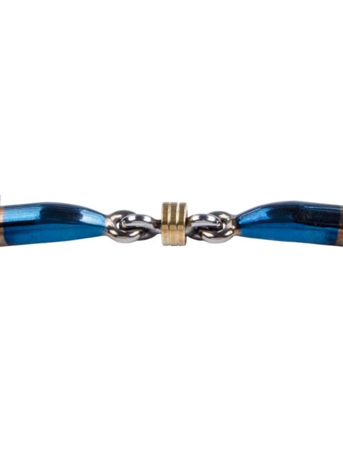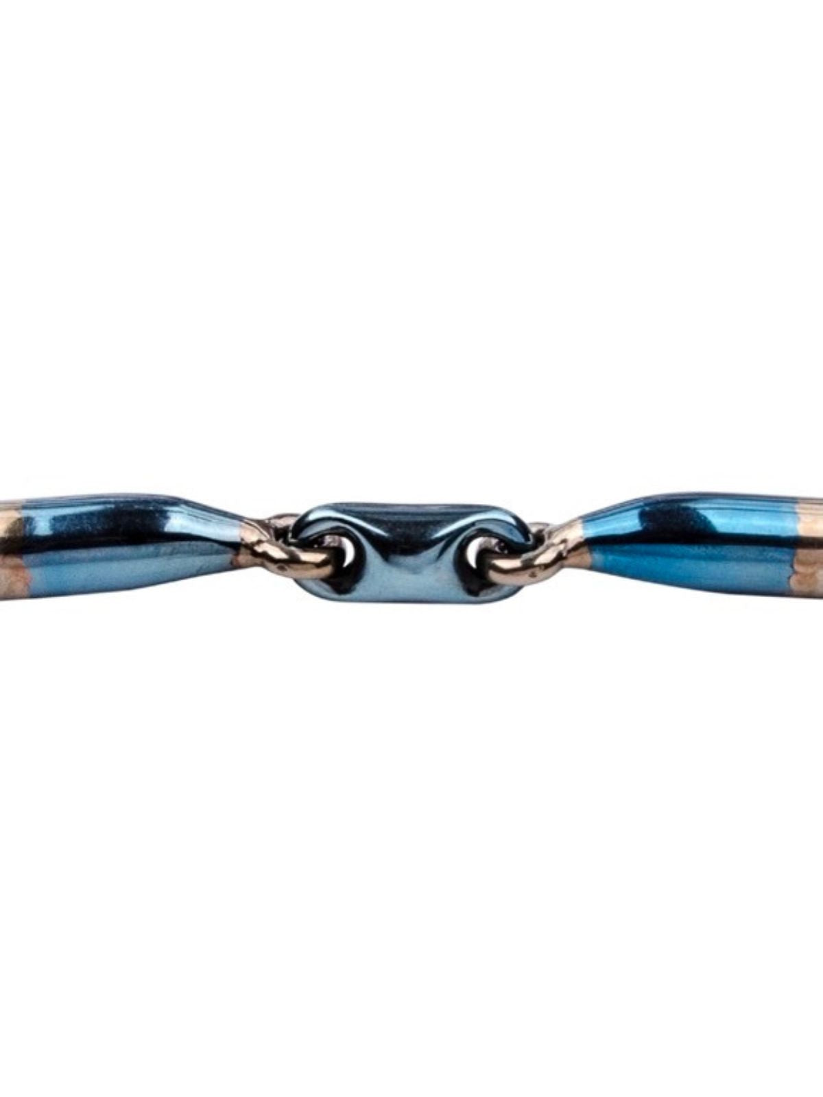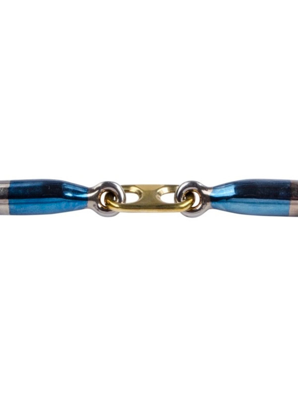 Das Mundstück mit Messingringen ist eine Variante des doppelt gebrochenen Gebisses. Es eignet sich für Pferde mit extrem wenig Zungentätigkeit. Mit diesem Gebiss wird die Zungenaktivität gefördert. Bitte beachten: Bei anderen Pferden kann das gerade zu einem unruhigen Maul führen.